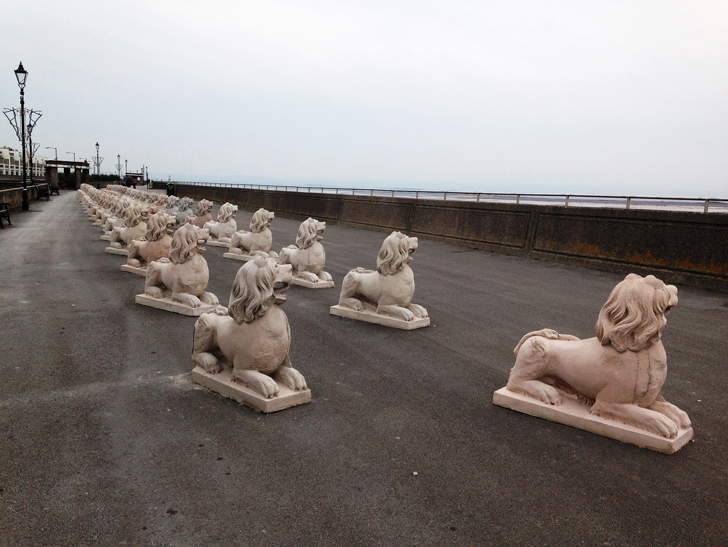 Moss took the mould to a local concrete garden ornament factory, where they made an army of 41 lions. In October 2015, the concrete army was installed along the esplanade at Burnham-on-Sea, along the Bristol Channel, working with the men from the concrete garden ornament factory. This location is especially significant for its early experimental uses of defensive curved concrete, and the lions formed an alternative flood defence system along the promenade.